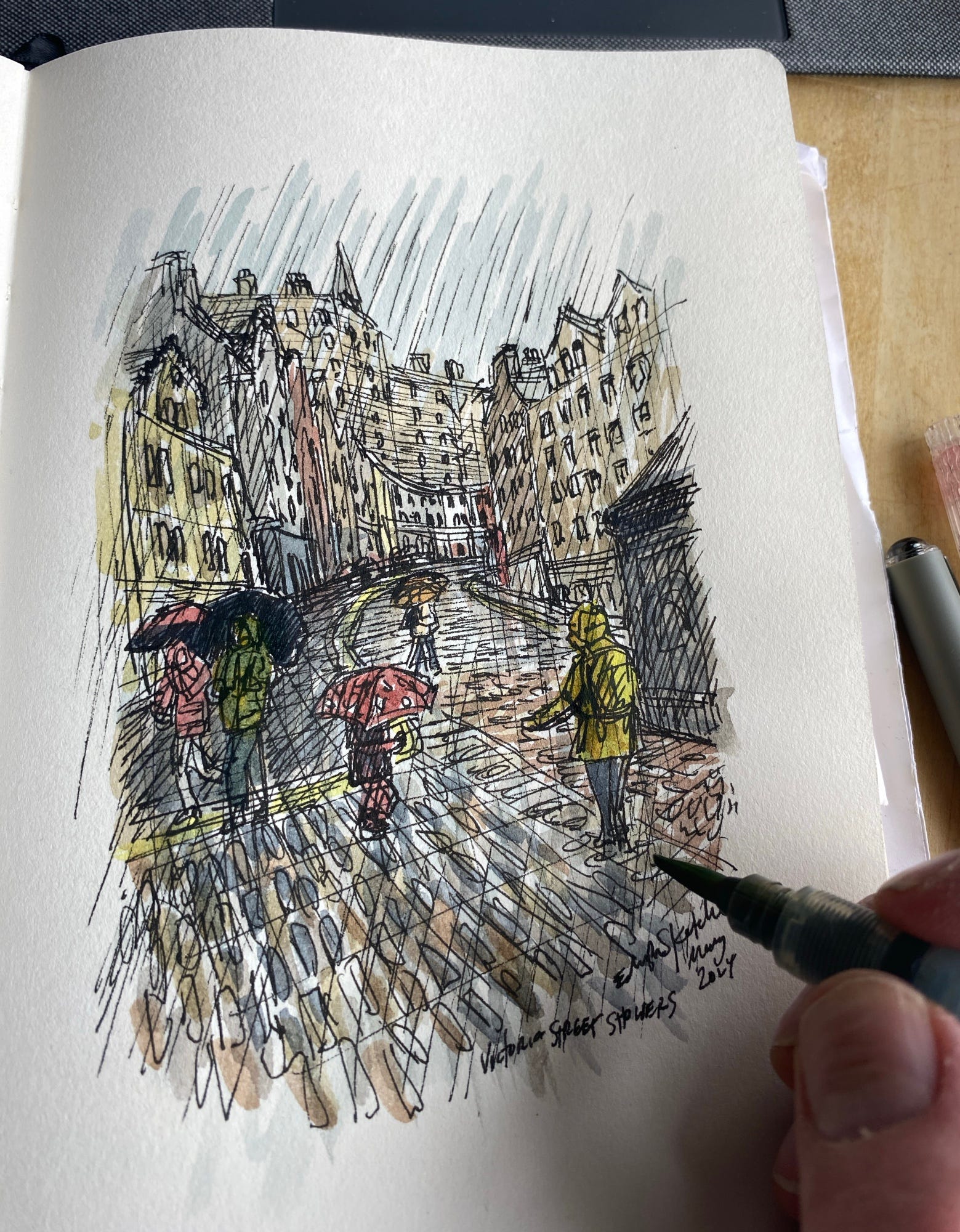 I admit I sketched this one from a cafe after passing the tourists walking up and down Victoria Street in the rain this morning. I did feel a little sympathy with them all posing for photos and selfies with the brollies up and the rain dripping down their faces, but they were all smiling. Edinburgh is beautiful whatever the weather.