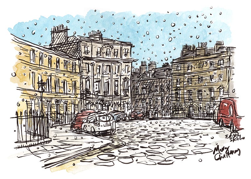 I think I might make this one into a Christmas card for next year. i used a brush pen and it has given the drawing a bit more of an illustration feel. What other locations around the city would you suggest for a first flurry sketch? If I get six I will make a pack of cards for next year.
