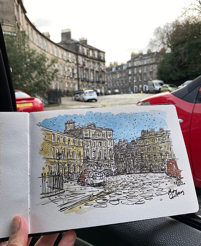 I pulled up in the car on Monday morning to make a little sketch of the New Town before a meeting and couldn’t help adding in some snow. I am wishing the first flurry isn’t too far away :)