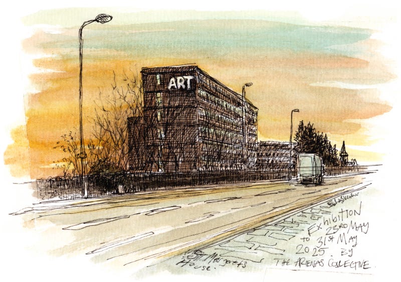 A sketch of St Margaret’s House on London Road, a creative hub of activity with workshops, Artist studios and exhibitions like the one I am taking part in. ‘For Love Or Money’ is the first exhibition from The Arienas Collective, with whom I run my workshops from in the New Town.