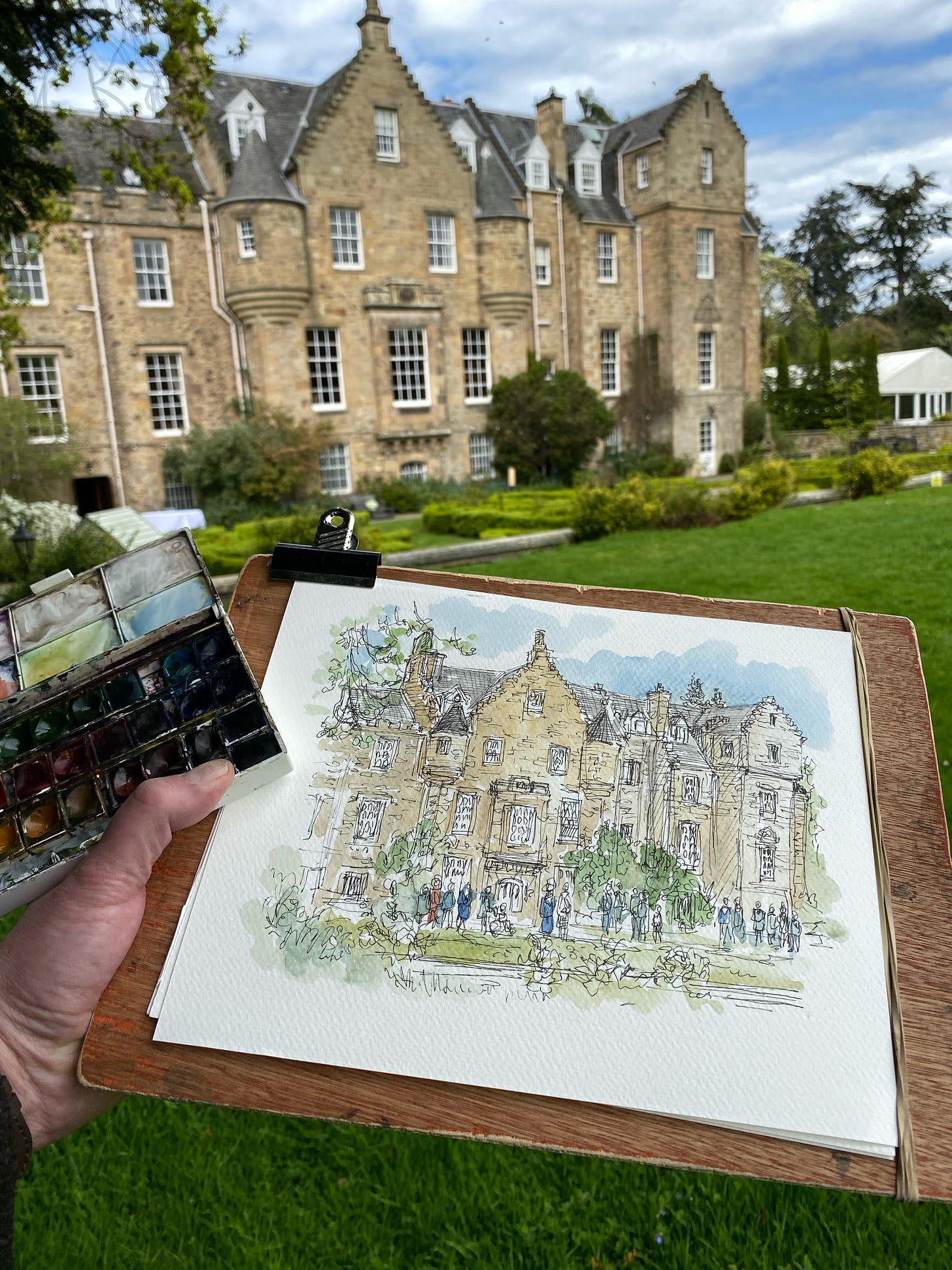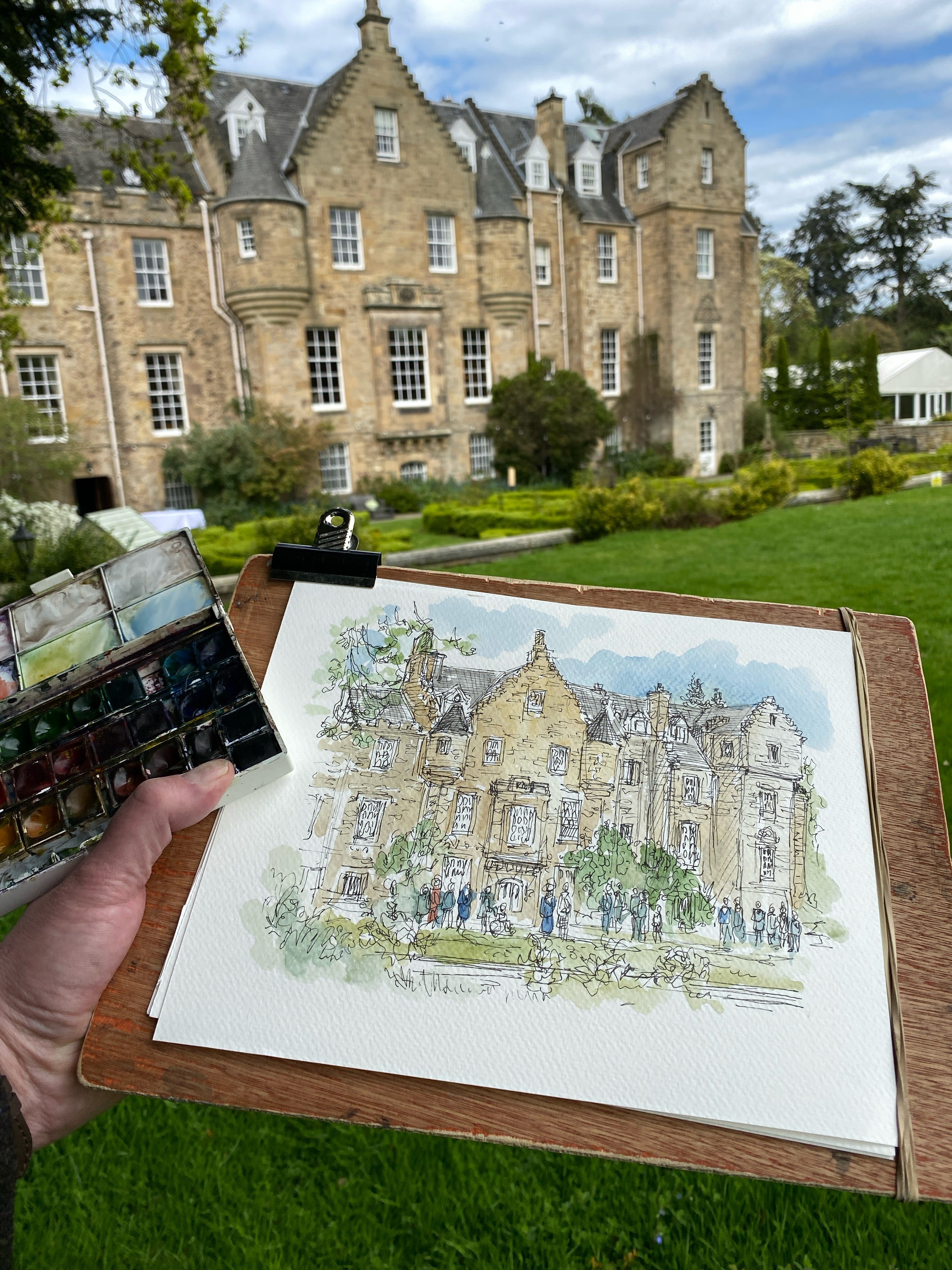 I like to draw the venue and have been to some amazing castles and grand highland houses as MyWeddingSketcher and always surprised by how many gorgeous buildings are hidden away around the country, like Carberry Tower (above) which I visited this week which is just outside Edinburgh in Musselburgh.