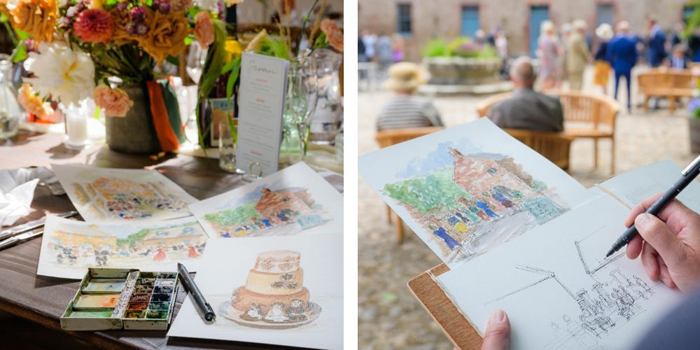 I usually create around ten watercolours that I can then scan and turn into a lovely coffee table style book for the married couple. But recently I have been combining this with favour sketching where I create little watercolour sketches of couples in their beautiful outfits. After seeing how wonderful guests look at weddings in colourful kilts and flowery flowing dresses it seemed perfect to capture that special day feeling with a little watercolour sketch.