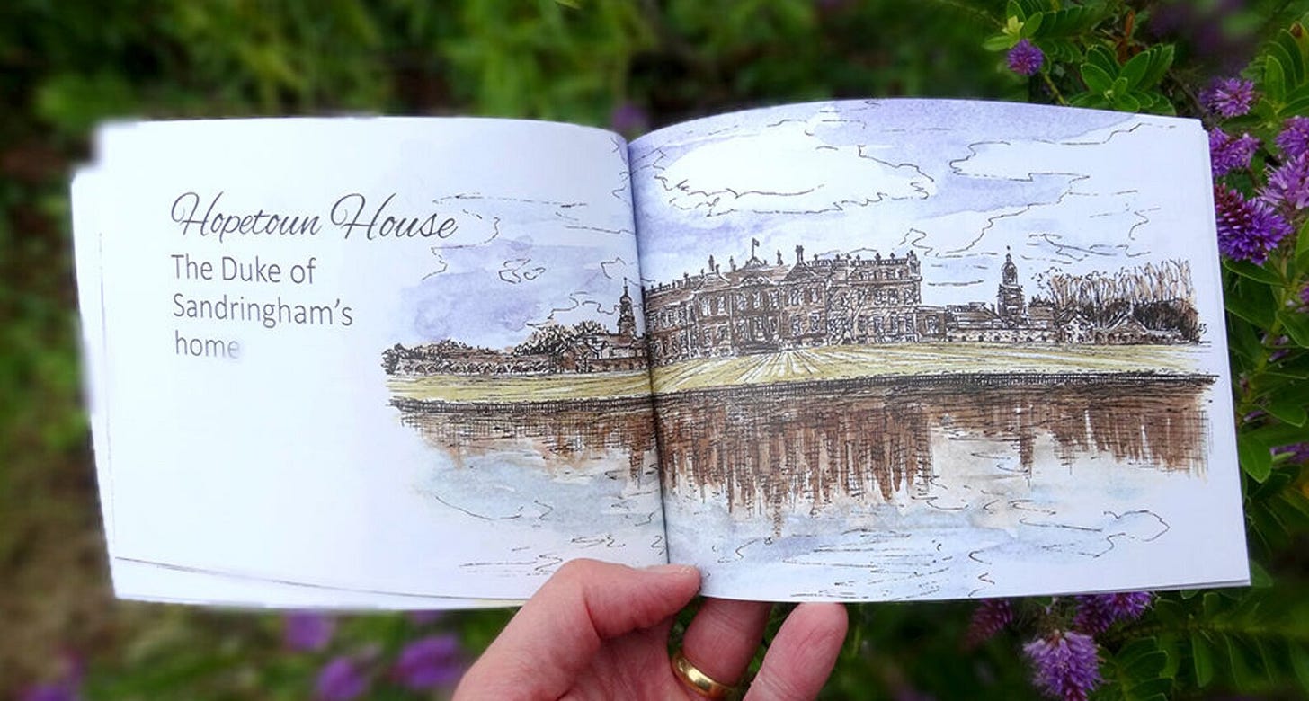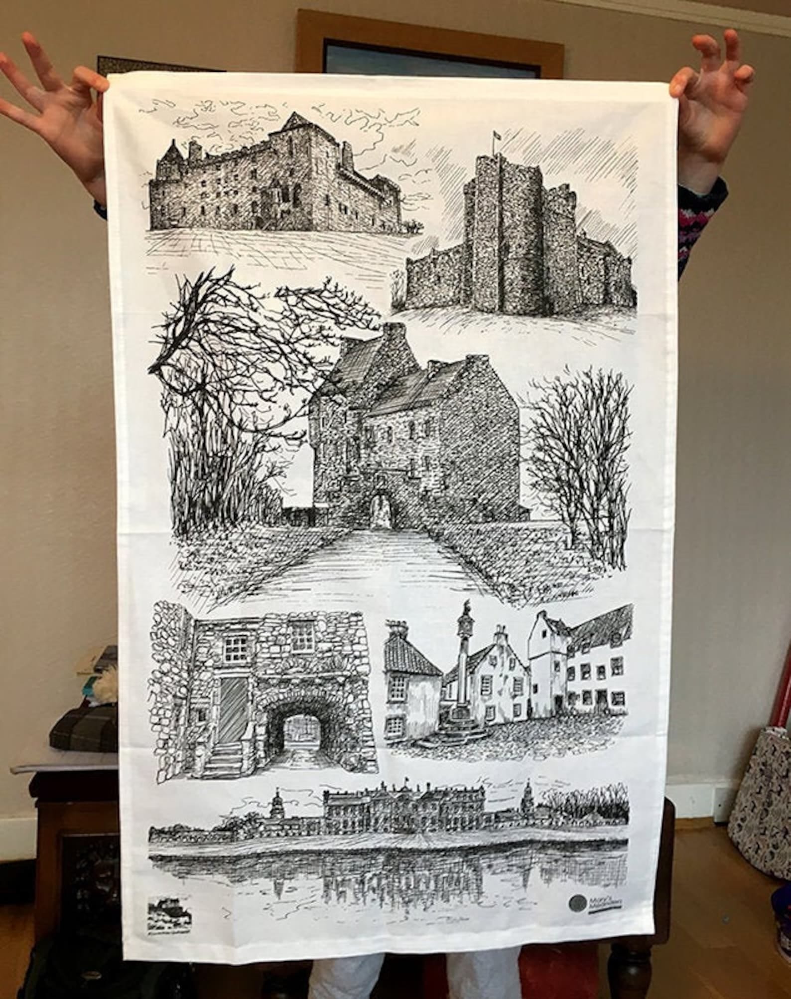 After the book was made we used the drawings to make the above tote bag and the tea towel of a number of the locations below. All are available at the Midhope Castle kiosk and also on my Etsy page below.