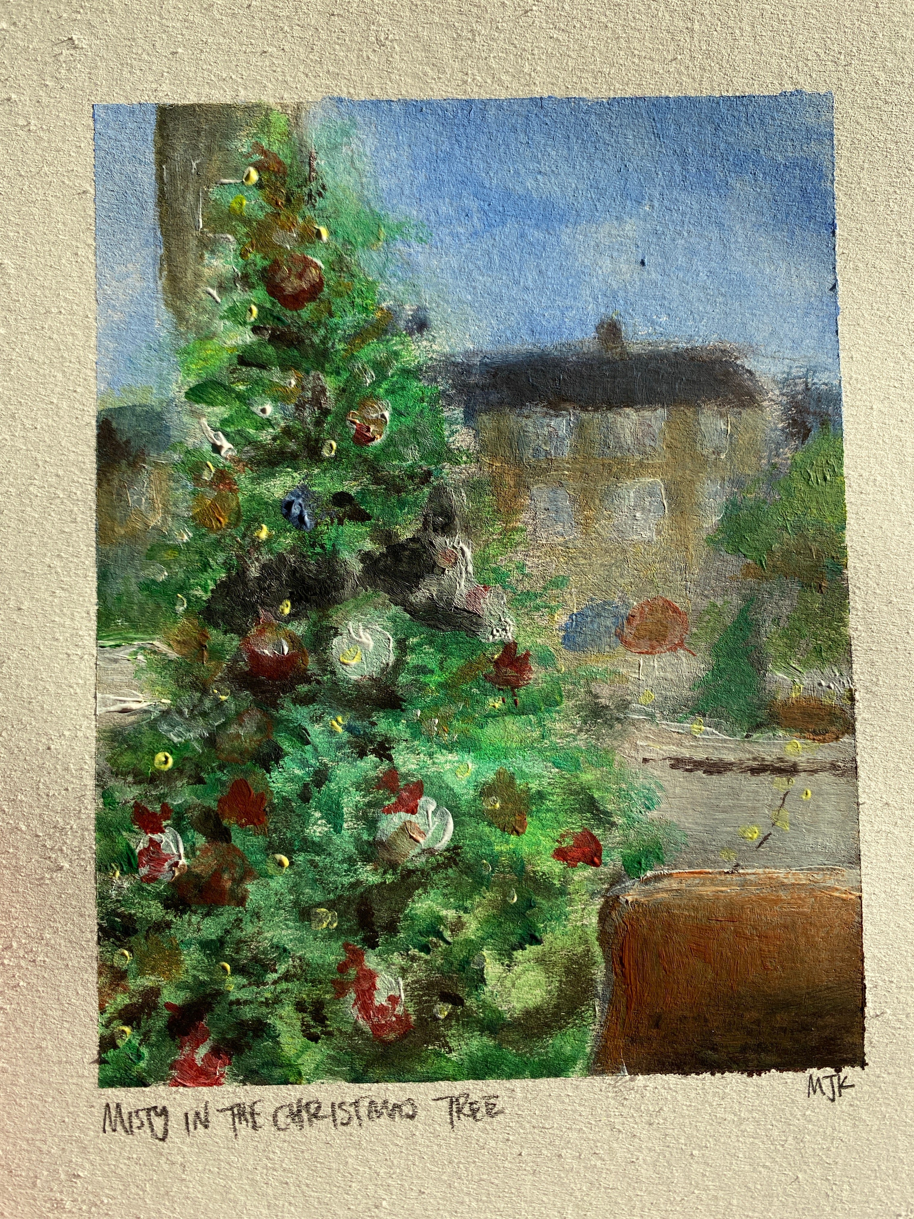 Painting with acrylics today, enjoying the time at home with family. After a fun workshop with art_tutoredinburgh (instagram) last month I wanted to try paints again. Can you see Misty my cat in the tree? This was the first Christmas she realised she could climb inside for a great view of the street 😊🤣 Slide to the right to see a photo of her in the tree. #festivefun #christmastime
