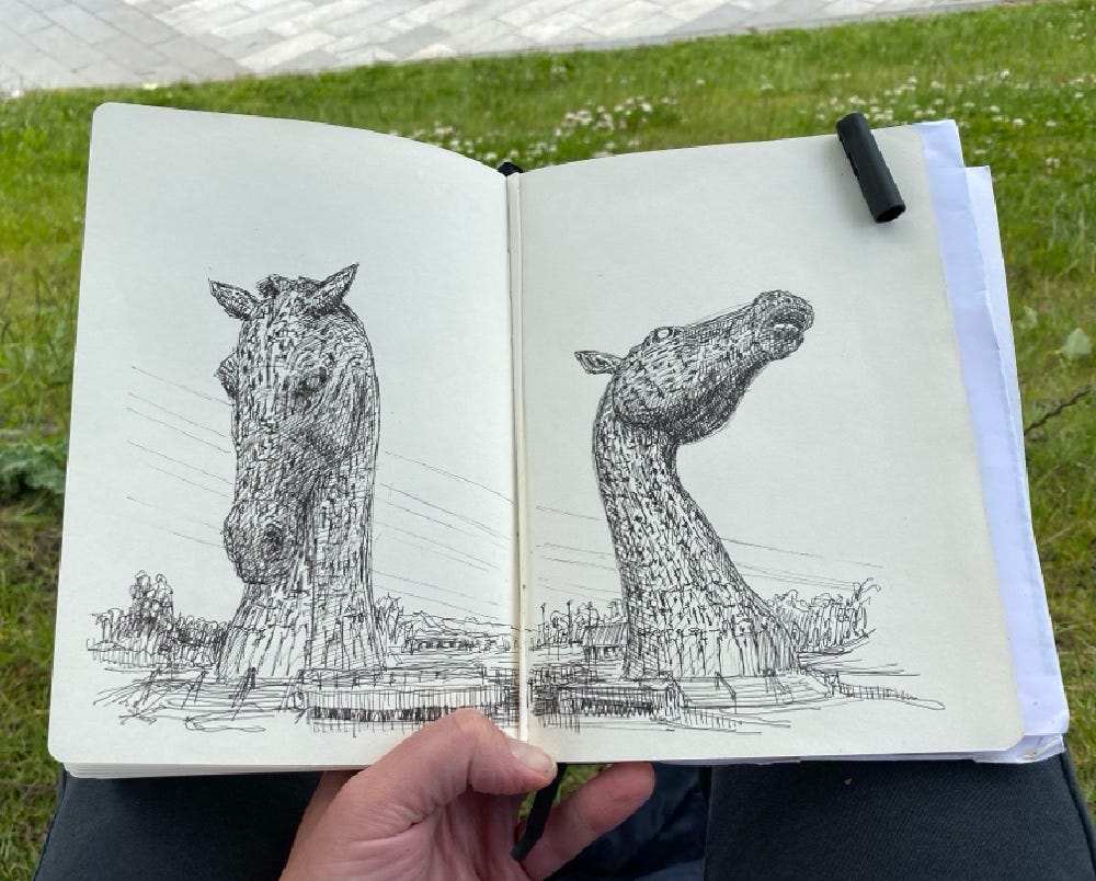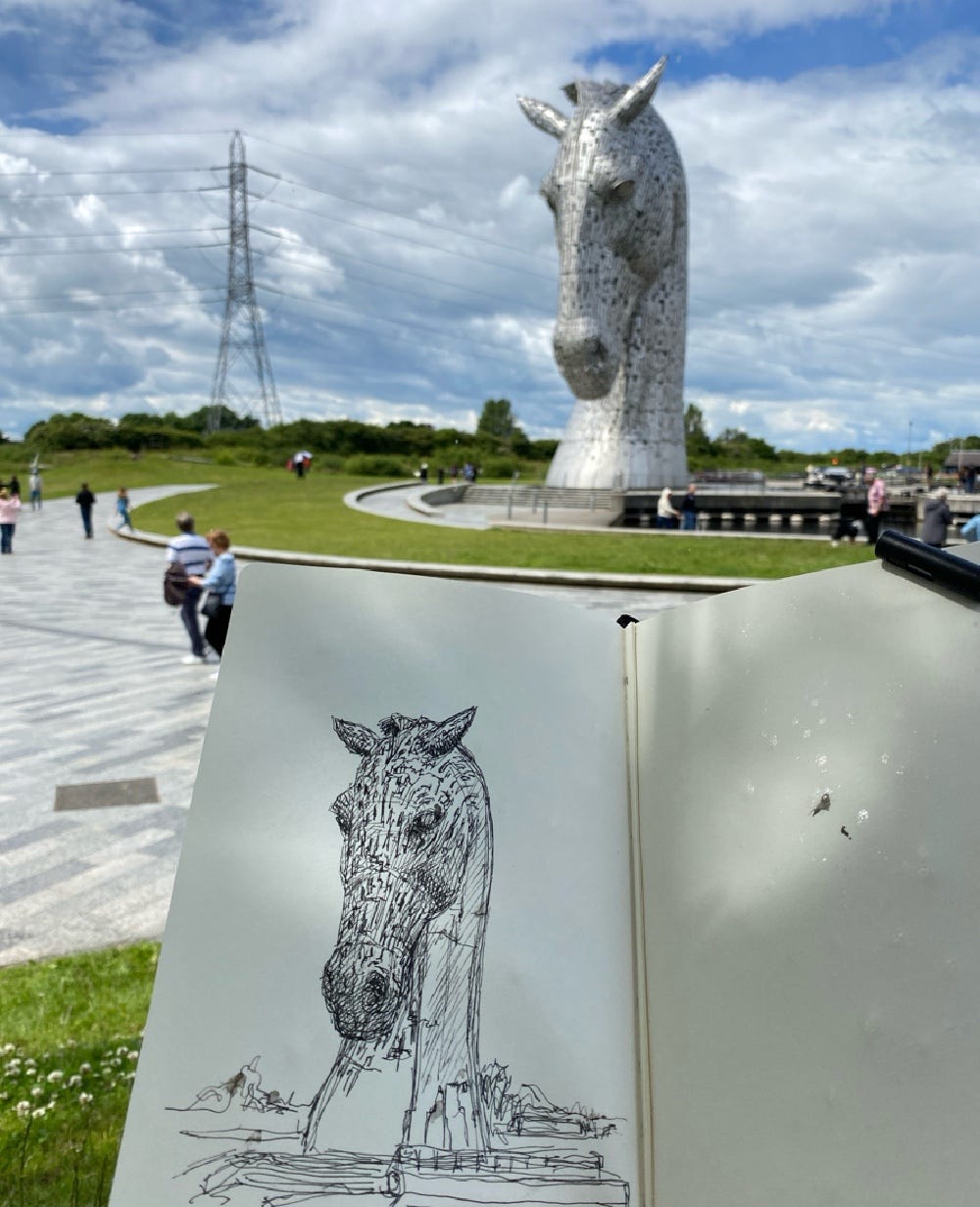 This morning I had a delivery of six huge sketches for an office through in Uddingston near Glasgow. So I thought to break up the journey back to Edinburgh I would make a stop at the Helix centre and say hello to the Kelpies, two huge sculptures by Scottish artist Andy Scott.