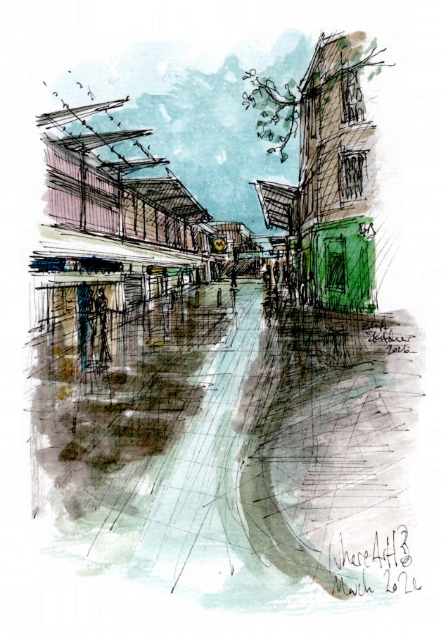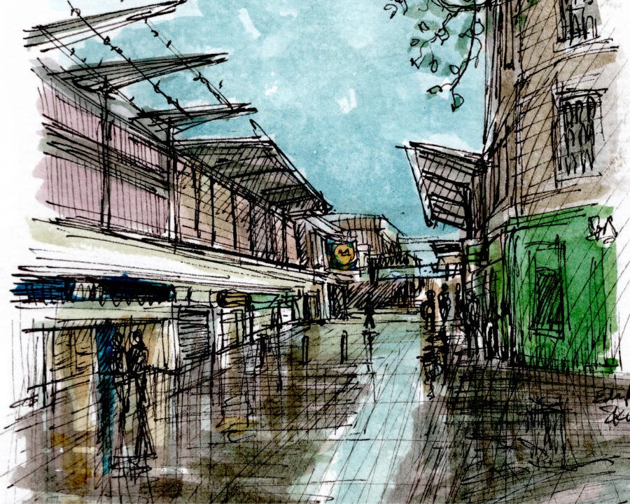 The smooth paving creates some lovely reflections and the brutal 60’s architecture gives plenty of striking shapes. Perfect for a watercolour sketch.