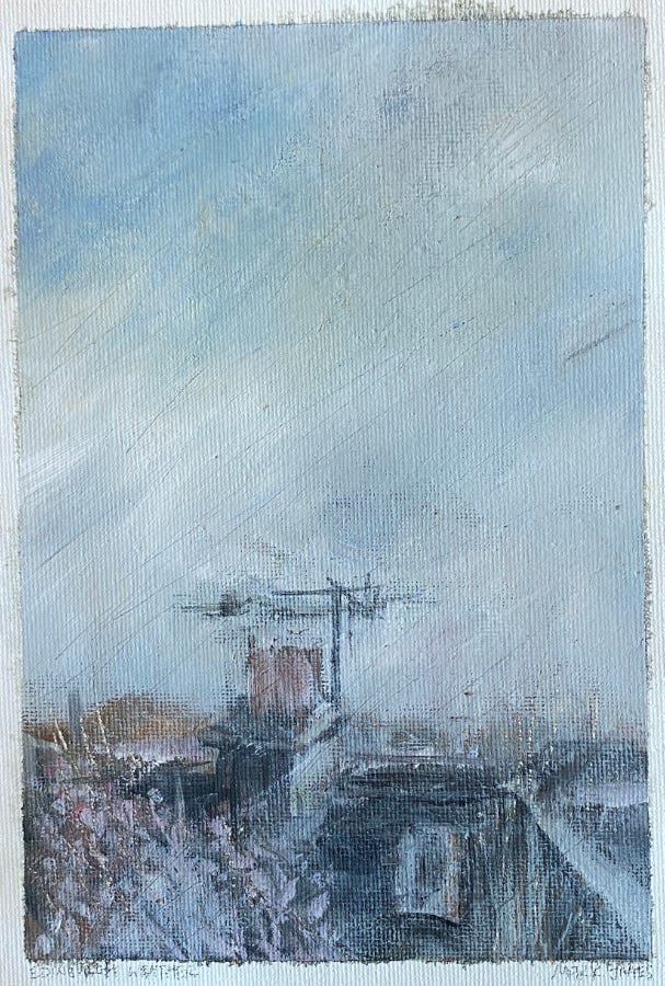 Today the weather was so bad I couldn’t see out of the window for the wind, rain and hail. I needed a break from my commissions (procrastination I know but hay ho) so I had a go capturing the changing weather from my studio with acrylics and a little oils. I love how the colours mix and magic happens.