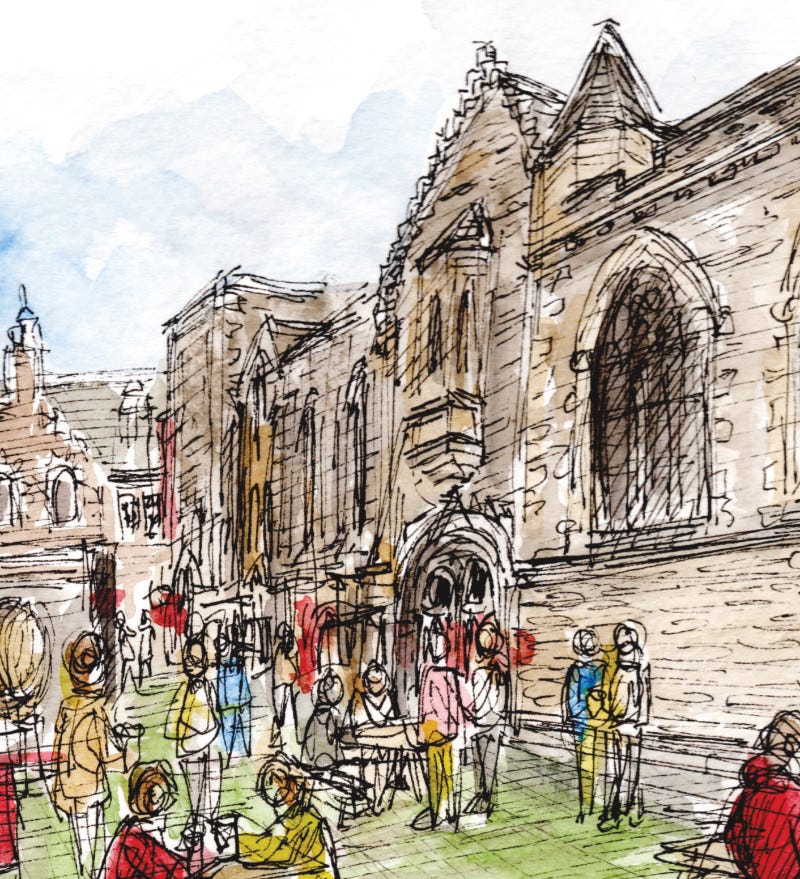 Each Monday morning I post a part of the city and you have to tell me where I have been sketching. After 24 hours I will pick one correct answer to receive a set of my Edinburgh location gift cards featuring my inky scribbles from the city.
