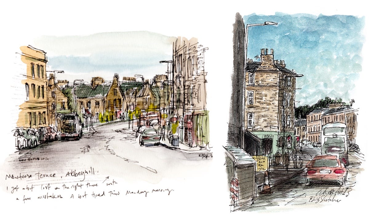 I was sketching on Montrose Street in Abbeyhill and realised when I came to scan and save my piece on the computer that I had sketched there in the past, but looking up the hill in the previous direction.