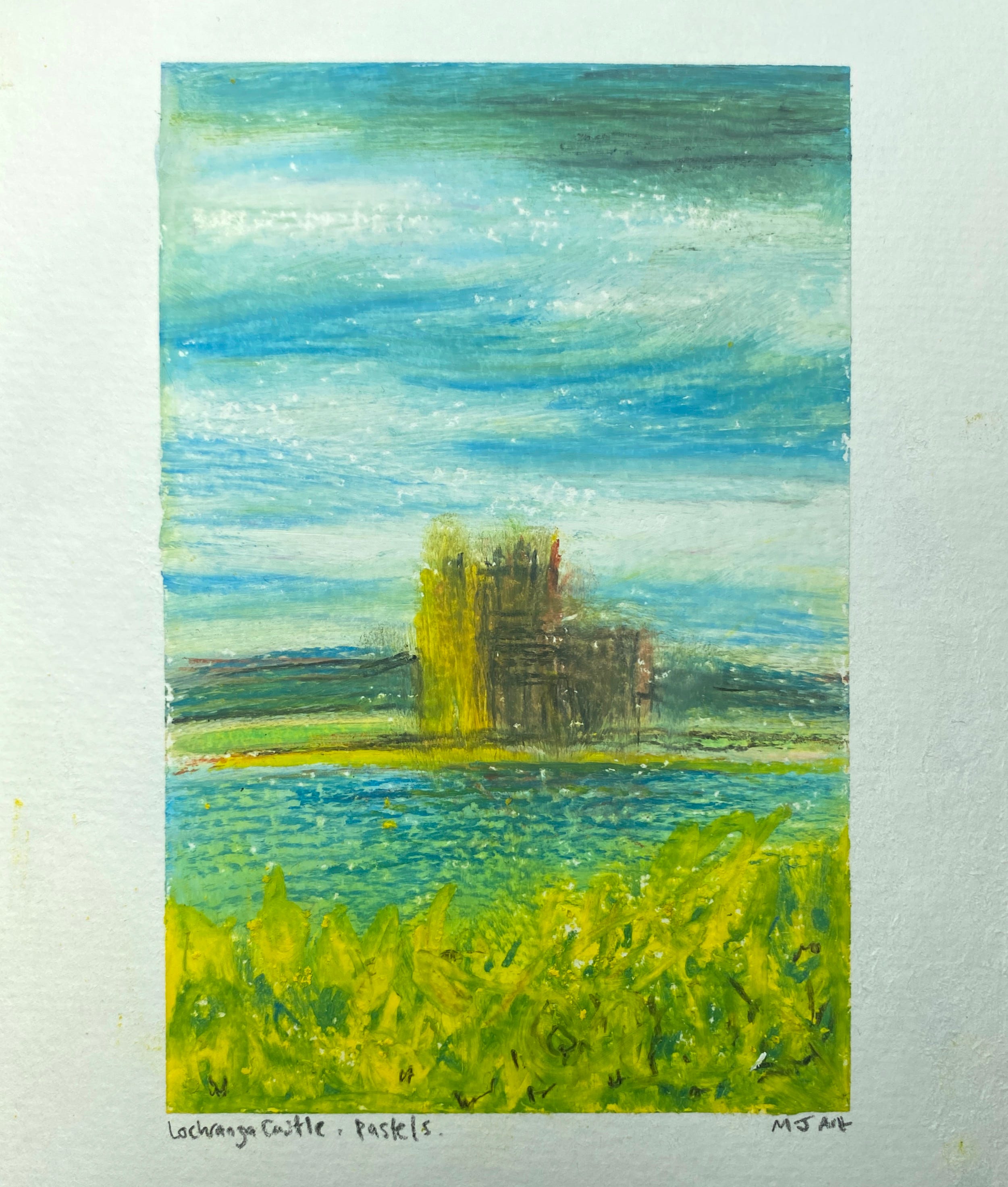 Letting go of the details I used thick oil pastels to capture the bright colour of the gorse but also the gloomy clouds above. I used masking tap before starting to create the sharp lines around the picture.